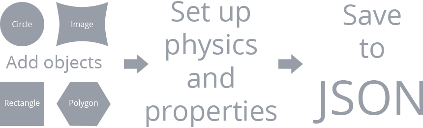 Hillmix is a useful tool for 2D games or other projects based on Box2D, before you get to coding. It helps easy to edit game levels and physics. Select folder with images that will be used for a project. Place images as bodies on scene. Draw bodies shape as rectangles, circles, polygons, polylines and set up physical properties of each object. Save that all to JSON format. Use saved file and any engine or programming language that fits best for your game in order to bring it all together. See video tutorial how it works.